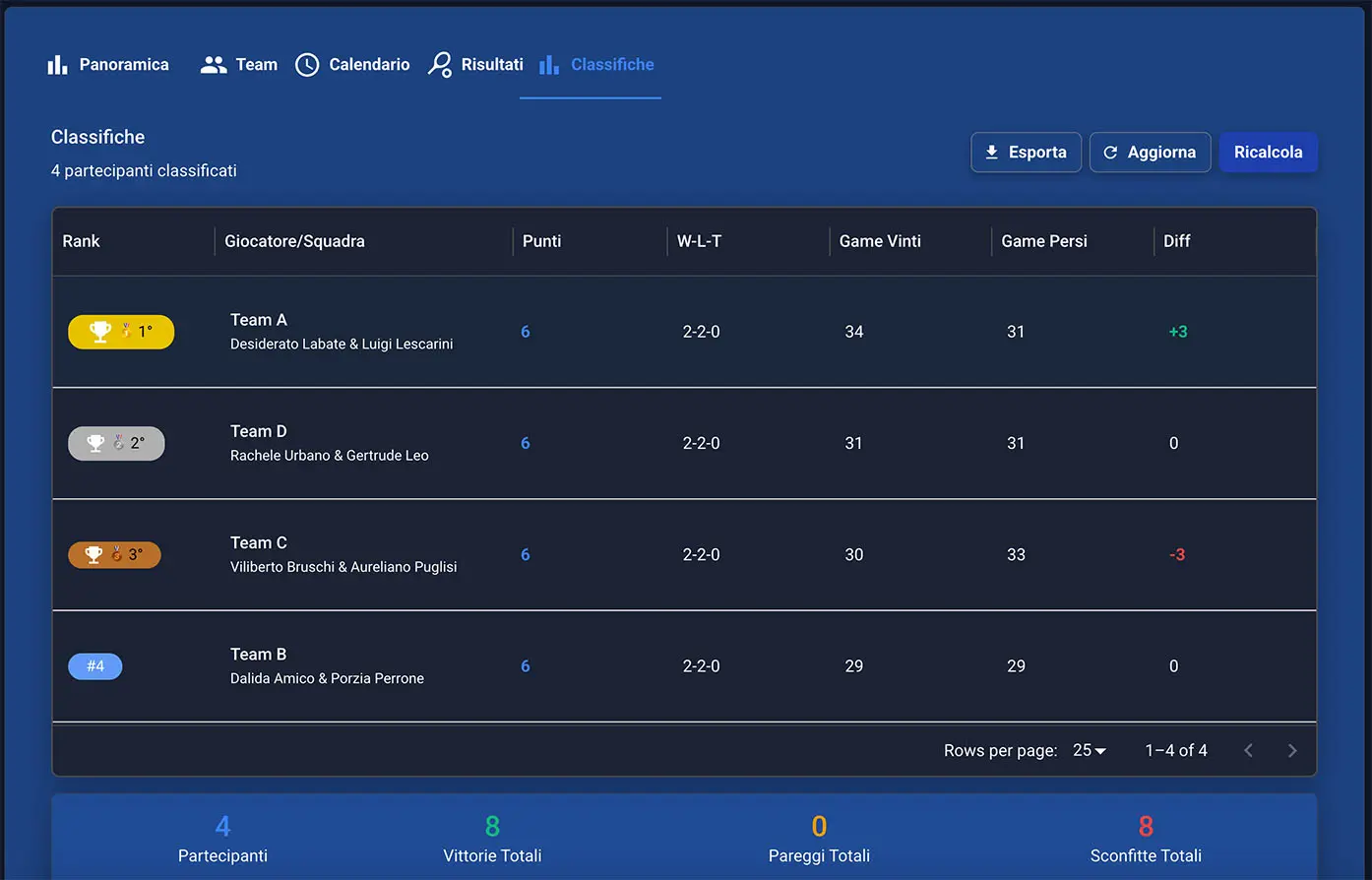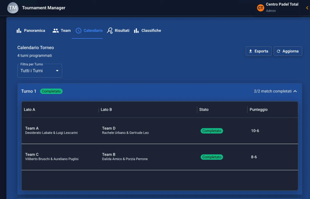 Risultati inseriti da giocatori, arbitri e organizzatori con visione a schermo in tempo reale